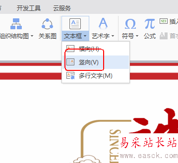 3、點擊“文本框”工具下方的倒三角,選擇“豎向”