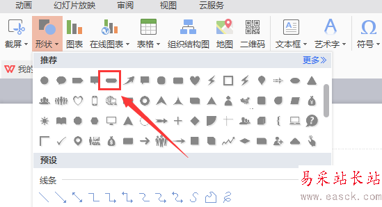 4、點擊形狀選項,在其子級菜單里找到推薦選項,如圖所示: