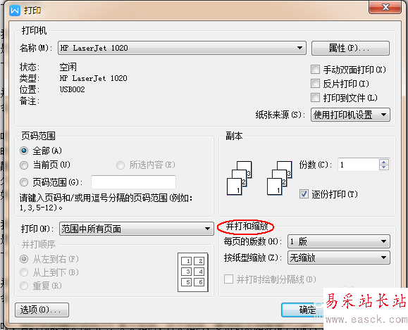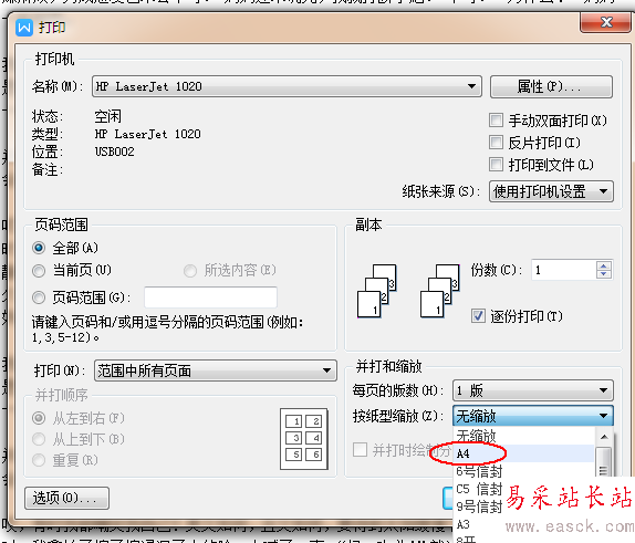 4、在“并打和縮打”選項中的“按紙型縮放”中選擇“A4”。(根據(jù)自己打印機(jī)的紙張大小設(shè)定。)