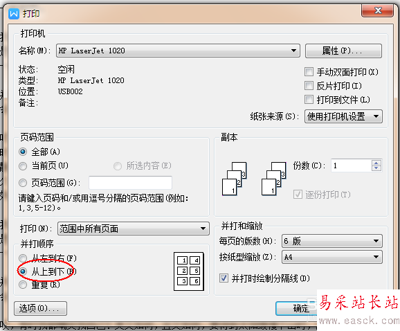 6、選擇好并打時,各頁在打印紙張上的位置。