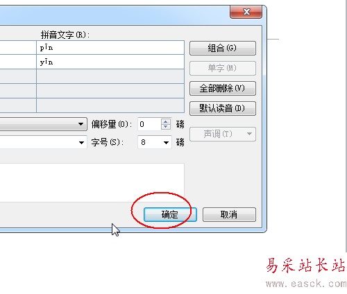 3、在拼音指南中我們可以對拼音的“對齊方式”、“字體”、“字號”和“偏移量”進行設(shè)置。如果沒有特殊要求,一般取默認(rèn)值即可。