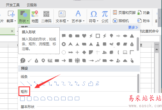 4、點擊形狀選項,在其子級菜單里找到矩形選項,如圖所示: