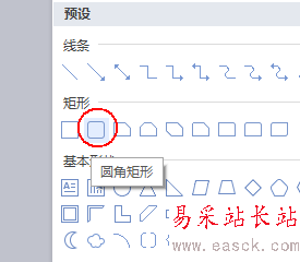2、點擊“形狀”工具,在彈出的形狀工具列表中選擇“圓角矩形”。