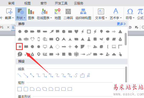 5、在推薦選項內找到太陽形狀選項,如圖所示:
