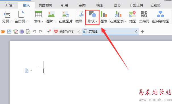 3、點擊插入選項,在其工具編輯區里找到形狀選項,如圖所示: