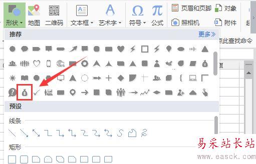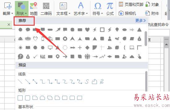 4、點擊形狀選項,在其子級菜單里找到推薦選項,如圖所示: