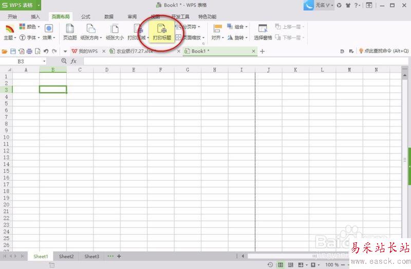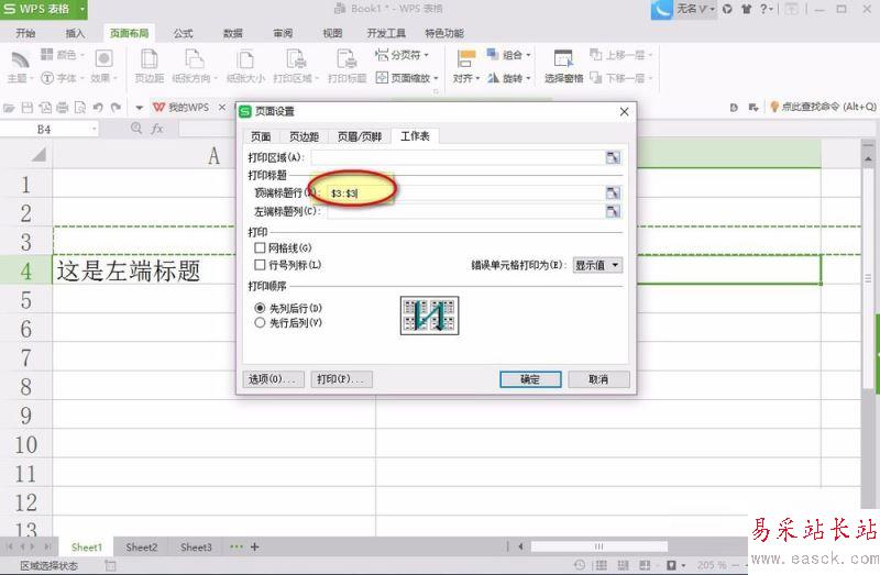 2、首先,在文檔中在“頁面布局”中打開,選擇:打印標題。在彈出的窗口中設置頂端標題行。