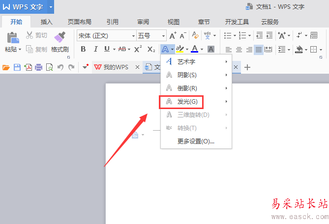 4、點擊文字效果選項,在其子級菜單里找到發光選項,如圖所示: