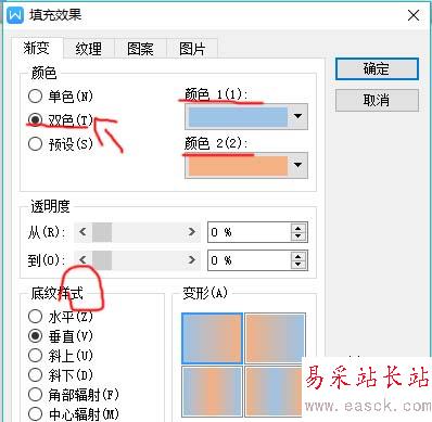 4、點擊雙色,右邊的顏色1和顏色2是漸變區域,小編選擇了自己最愛的兩個顏色,下面有底紋樣式,大家可以選擇自己喜歡的底紋樣式,這里小編選擇的是垂直樣式。