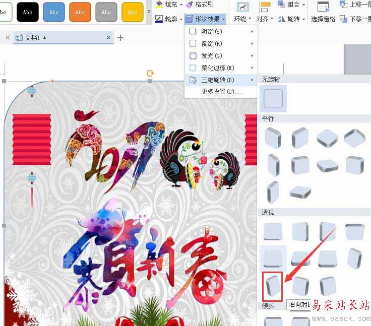 9、點擊形狀效果選項,在其子級菜單里找到三維旋轉選項,點擊三維旋轉選項,在其下拉列表里找到透視選項,在透視選項找到我們需要的選項,如圖所示: