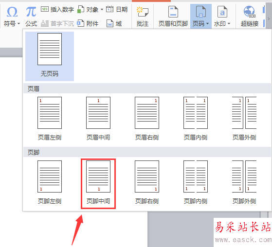 5、點擊頁碼選項,在其子級菜單里找到頁腳中間選項,如圖所示: