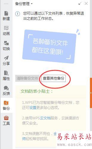 5、在ppt窗口的左側會看到如圖,選擇”查看其他備份“