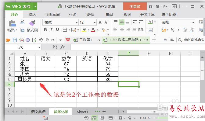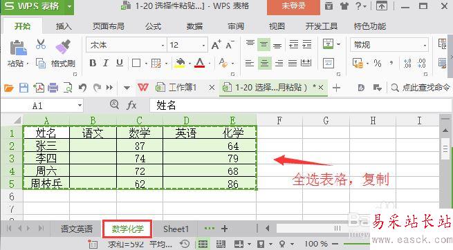 2、如果你想將錄有數(shù)學(xué)化學(xué)的工作表的數(shù)據(jù),復(fù)制到語(yǔ)文英語(yǔ)的工作表中,首先復(fù)制數(shù)學(xué)化學(xué)如圖所示