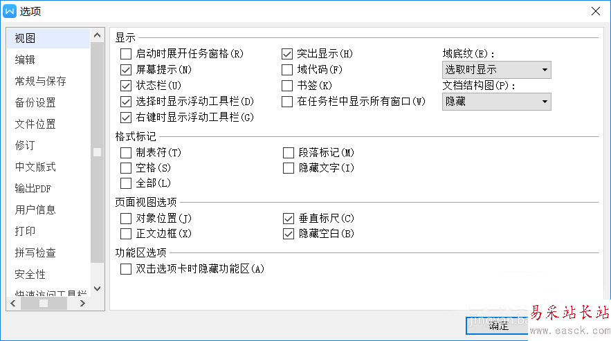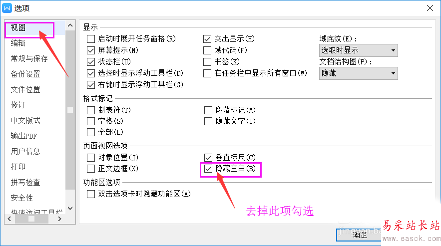 5、在【選項】窗口中的【視圖】欄中,將【頁面視圖選項】中的【隱藏空白】前的勾選去掉,即可使隱藏的空白顯示出來。