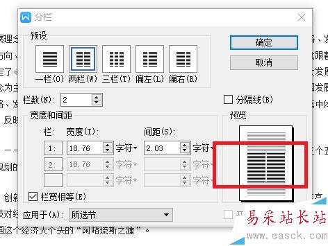 4、選擇二欄就會出現右下角的預覽圖片,可以通過點擊一欄、二欄、三欄、偏左或偏右來試一下效果。