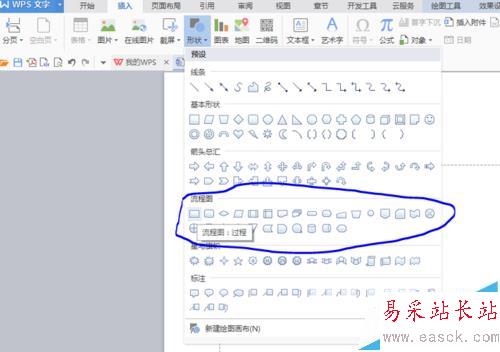 2、畫程序框圖肯定少不了各種形狀的方框,添加方法同上面添加畫布,插入>形狀>流程圖,即可選擇你需要的程序框了