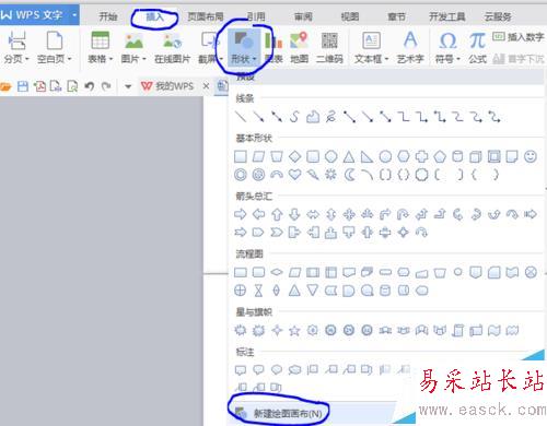 1、新建一個(gè)word文檔,首先我們需要添加一個(gè)畫布,添加方法如圖所示,先在工具菜單中選擇“插入”,然后選擇“形狀”,打開下拉菜單選擇最后一個(gè)添加畫布,如圖二。