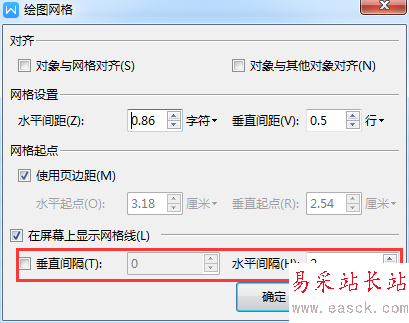 8、在彈出的繪圖網(wǎng)格界面中,我們看到最下面的在屏幕上顯示,下面有垂直間隔、水平間隔,可以根據(jù)需要進(jìn)行相應(yīng)的設(shè)置,然后點(diǎn)確定。