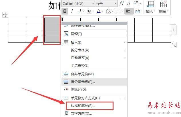 4、選中表格的任意一列,右擊,彈出菜單,下拉選項,選擇“邊框和底紋”(如下圖)
