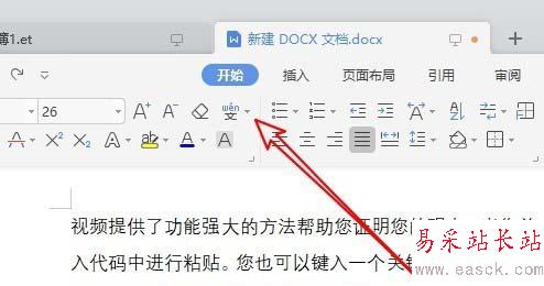 2、然后點擊wps2019菜單欄中的“開始”菜單,點擊開始工具欄上的“文字指南”的圖標。