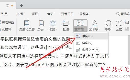 2、接著在打開的插入工具欄上點擊“文本框”的按鈕,在彈出菜單中選擇“橫向”的菜單項。