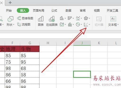 3、在打開的插入工具欄上,我們點擊“散點圖”的圖標。