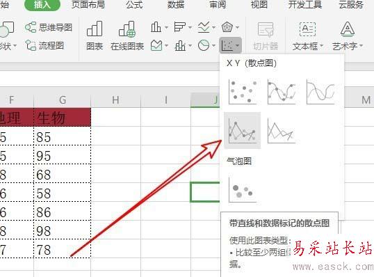 4、在彈出的下拉菜單中我們點擊“直線和數據標記的散點圖”的圖標。