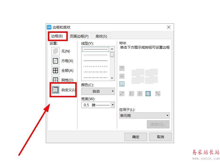 6、在“邊框和底紋”對話框,在默認打開的“邊框”選項卡中找到“自定義”單擊
