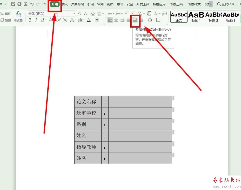 4、選中所有的表格,單擊“開始”選項卡,在菜單欄“分散對齊”單擊,讓字體擺放美觀一些