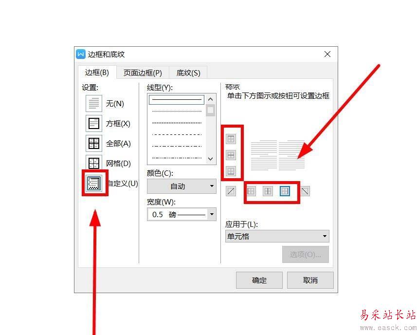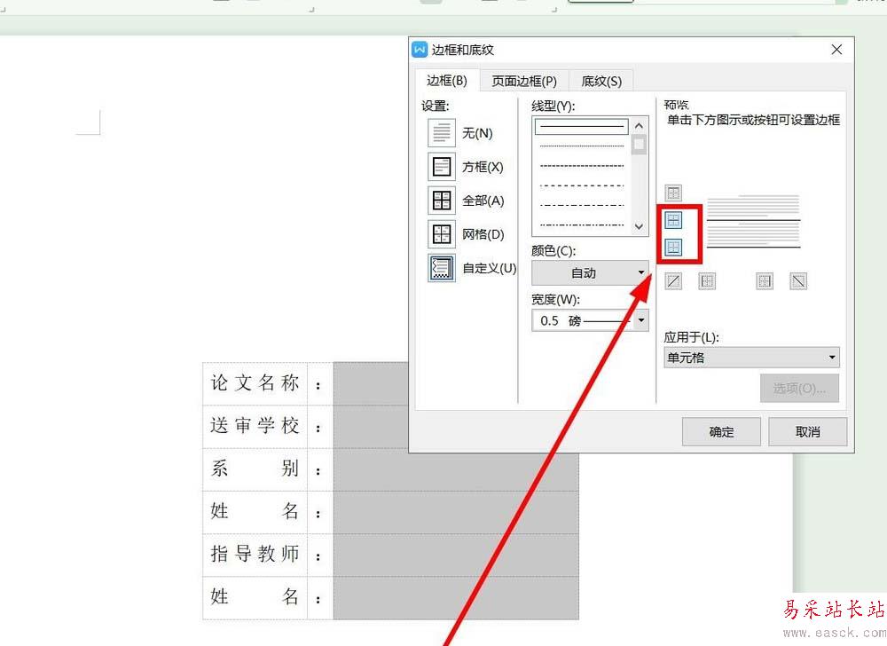 9、在“邊框和底紋”對話框,依然使用“自定義”這項功能,單擊“添加中橫線”和“添加下框線”,完成后單擊“確定”
