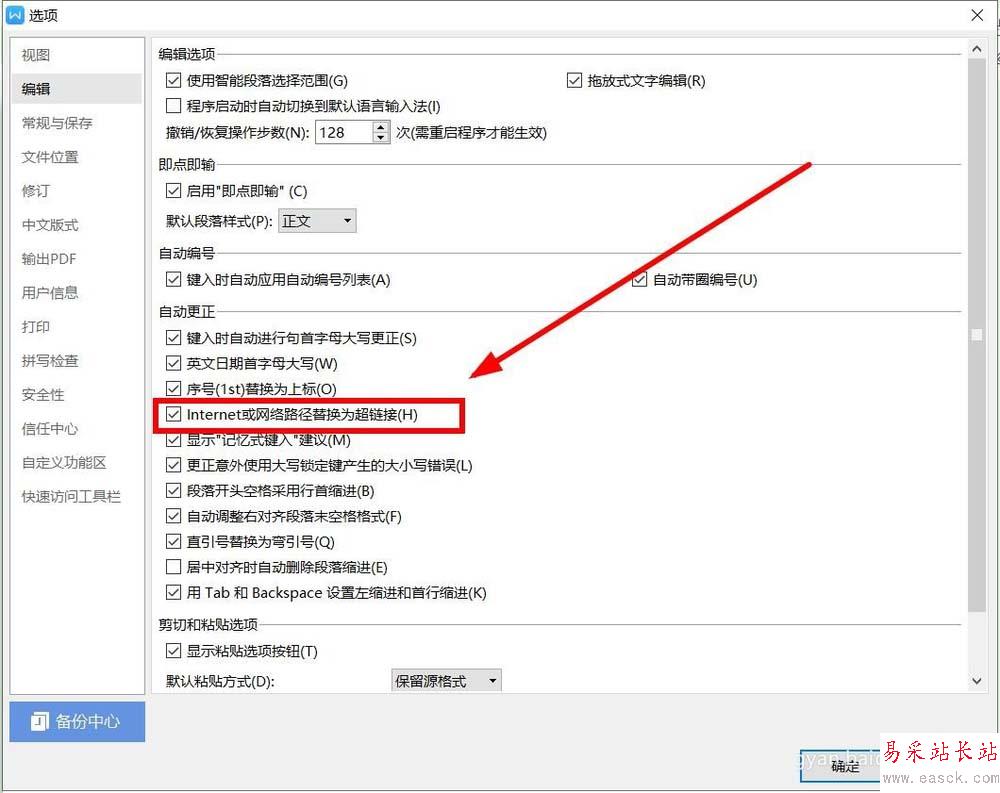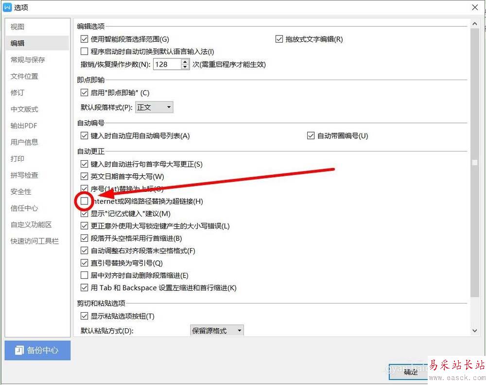 7、在這里的“internet及網(wǎng)絡(luò)路徑替換為超鏈接”前面的方框單擊,去掉勾選該項