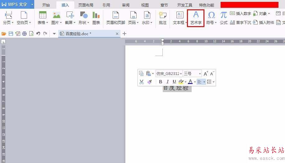 3、選中要設(shè)置為弧形的文字,在菜單欄“插入”中選擇“藝術(shù)字”。