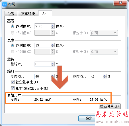 7、在大小選項卡中圖示的位置即可查看該圖片的原始大小是多少厘米。