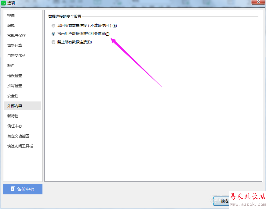 6、【外部內容】點觸開之后,這個默認設置的是【提示用戶連接的相關信息】,如圖。