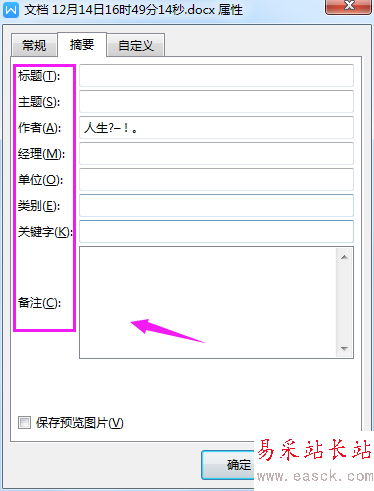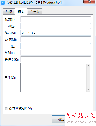 6、【摘要】這里,我們要設置的就很多了,如【主題、標題、作者、經理、類別、關鍵字】等都可以填寫,如圖。