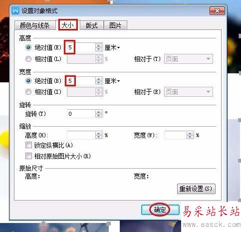 5、切換至“大小”選項卡,根據自己的需要設置圖片的高度和寬度,設置完成后單擊“確定”按鈕。