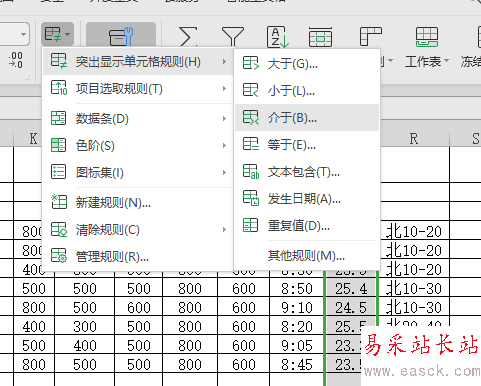 4、選擇【突出顯示條件規(guī)則】-【介于】。