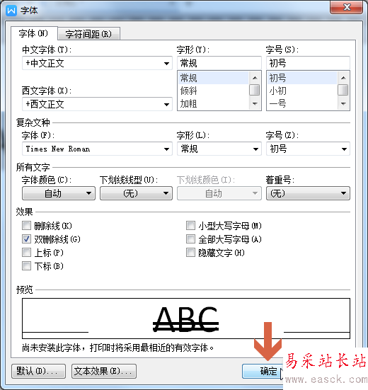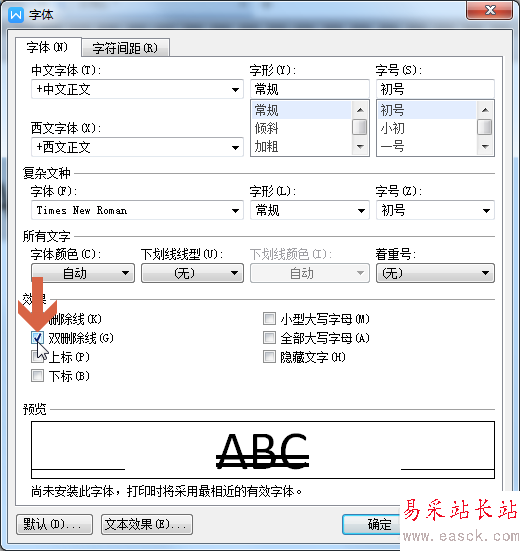 5、打開對話框后,點擊勾選圖示處的【雙刪除線】選項。