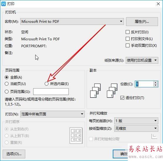 6、這時就會彈出wps2019的打印設置窗口,在窗口中選中“所選內容”設置項,最后點擊確定按鈕就可以了。這樣我們就可以只打印選中的內容了。