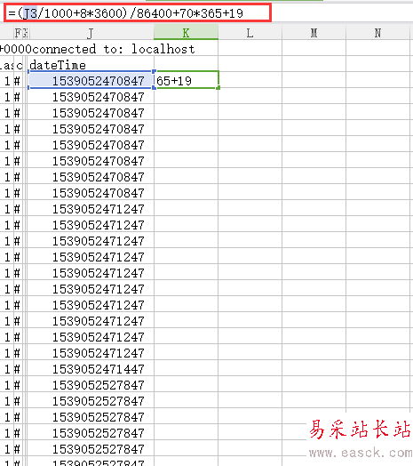 4、然后在表格里,輸入公式:=(J3/1000+8*3600)/86400+70*365+19。這里的J3為時間戳表格位置