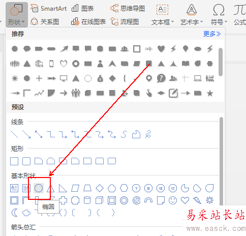 3、在彈出的菜單列表中單擊【橢圓】選項。