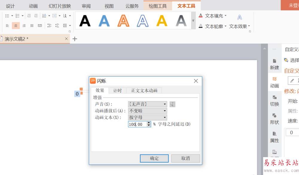 8、在效果選項卡中,將動畫文本設為按字母,延遲填100,點擊確定。如圖。