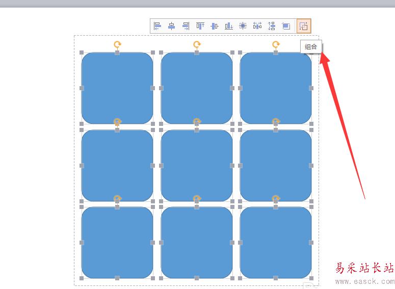 4、然后全部選中九個矩形,使用組合命令,如圖所示,這樣就是一個大的整體正方形了。