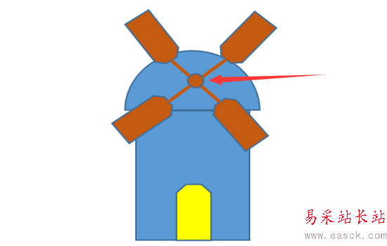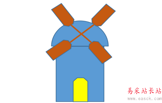 4、再使用【剪去同側角的矩形】,在磨坊的屋頂上方,畫出四個如下圖的形狀,并按下圖的樣子排列好,作為磨坊風車的風翼。并設置填充色的【巧克力黃】。如下圖。
