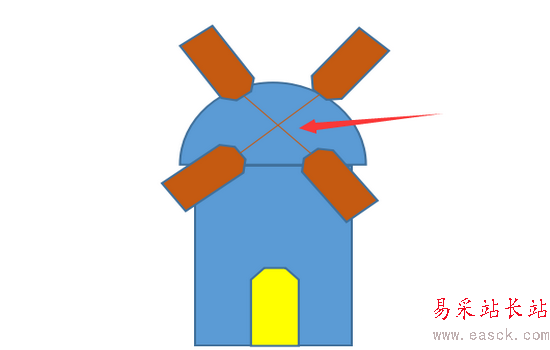 5、使用【直線】將風車的風翼對角兩個相連接,如下圖所示。直線的顏色設置成【巧克力黃】,線型加粗一些。