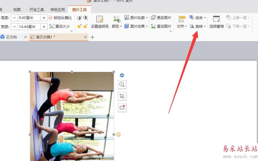 1、插入圖片后在右上角會出現一個圖片編輯的工具,然后點擊選擇旋轉工具,如圖所示。
