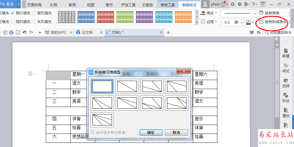 6、在左上角,要畫(huà)一個(gè)斜線,選擇左上角格子,變?yōu)榛疑?,在菜?---文字---表格樣式---繪制斜線表頭,選擇想要的樣式,點(diǎn)擊。