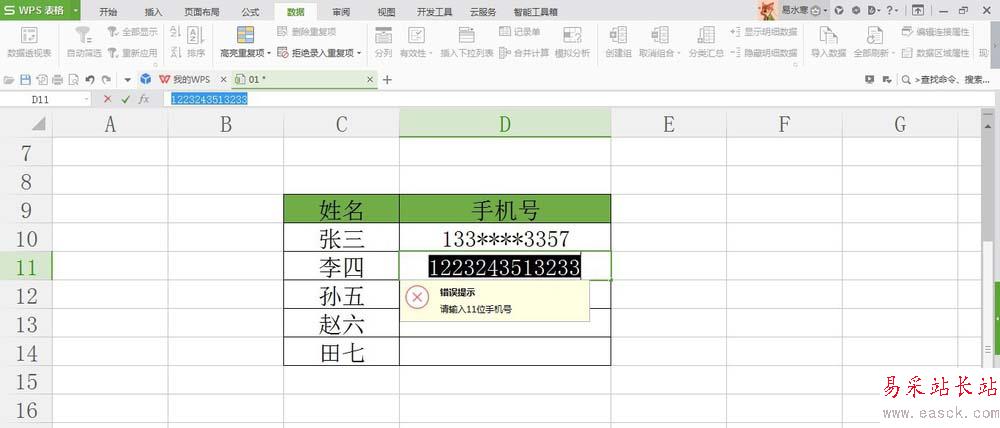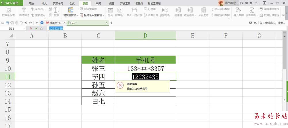 5、點擊確定,可以看到輸入數字不足11位時會提示錯誤信息;