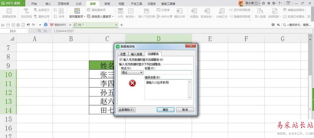 4、出錯警告樣式選擇“停止”,錯誤信息為“請輸入11位手機號”;