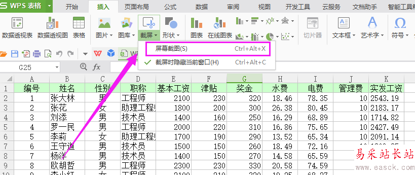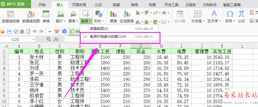 3、然后,點擊選項卡插入命令下的截圖命令,你可以選擇屏幕截圖和截圖時隱藏當前窗口,我們選擇屏幕截圖,這時,你可以截取當前表格中的內容了,如圖所示
